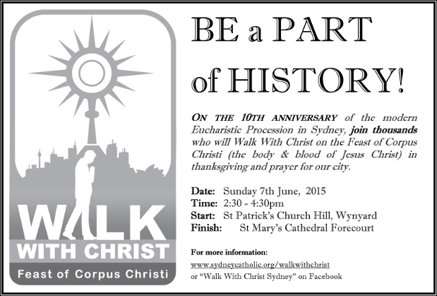 Bishop Terry Brady will lead the Procession through the streets of Sydney, starting at St Patrick’s Church Hill, Wynyard at 2:30pm and finishing at St Mary’s Cathedral Forecourt at 4:30pm.